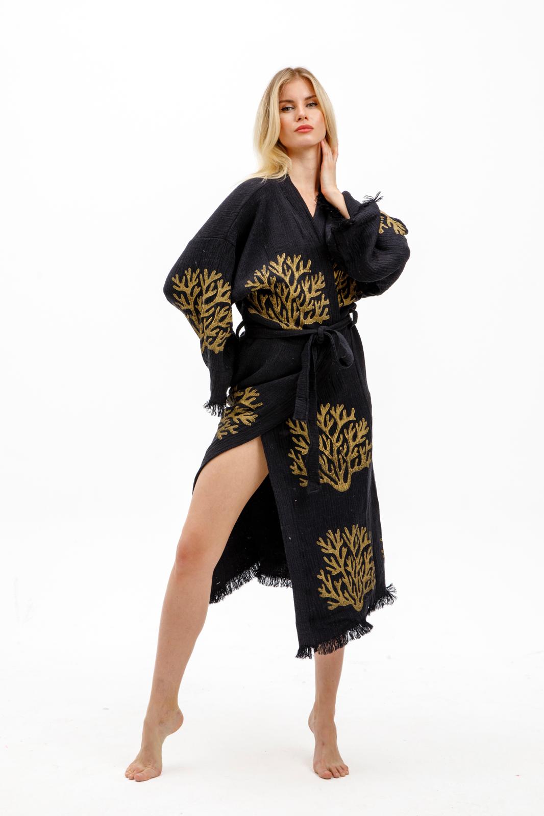 The stunning design featured on this garment showcases intricate coral motifs, symbolizing the beauty and resilience of marine life. The golden hues represent the warmth of the sun reflecting on the ocean, while the black background provides a striking contrast that enhances the overall elegance of the piece.