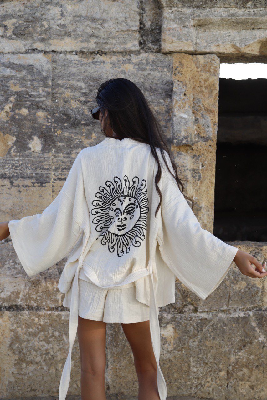 The unique hand-printed design on the back features the Sun motif, a symbol of vitality and warmth. In various cultures, the Sun represents life, energy, and positivity, embodying the essence of growth and renewal. Incorporating this design into the garment adds a unique and meaningful touch, making it not just a fashion statement but also a symbol of brightness and optimism.