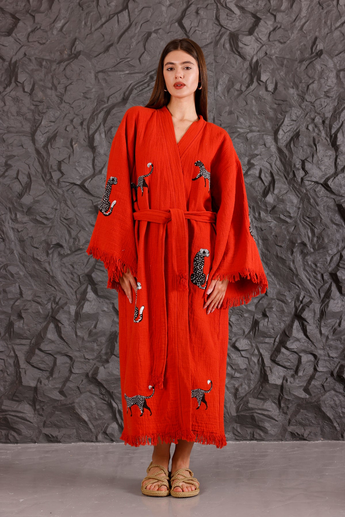 The robe is adorned in a beautiful pomegranate red color, which evokes feelings of warmth and passion. This vibrant hue makes a bold statement, adding an eye-catching element to your wardrobe.