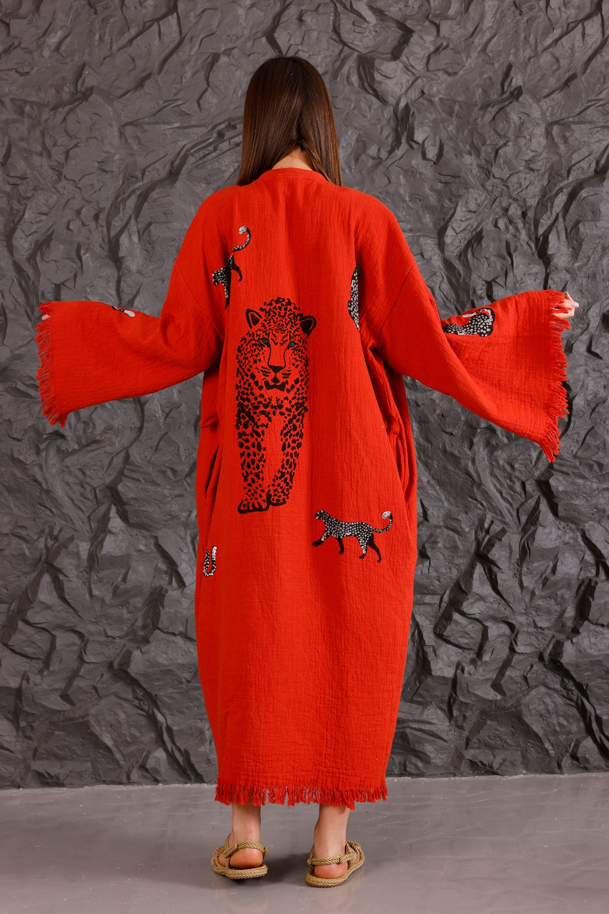 A standout feature of this piece is the hand-printed design on the back. This unique back print showcases a tiger, which symbolizes strength, courage, and grace. The tiger, often associated with power and confidence, serves as a reminder of our connection to wildlife and the importance of preserving our natural environment. Each hand print is distinct, reflecting the artistry and craftsmanship that goes into creating every piece.